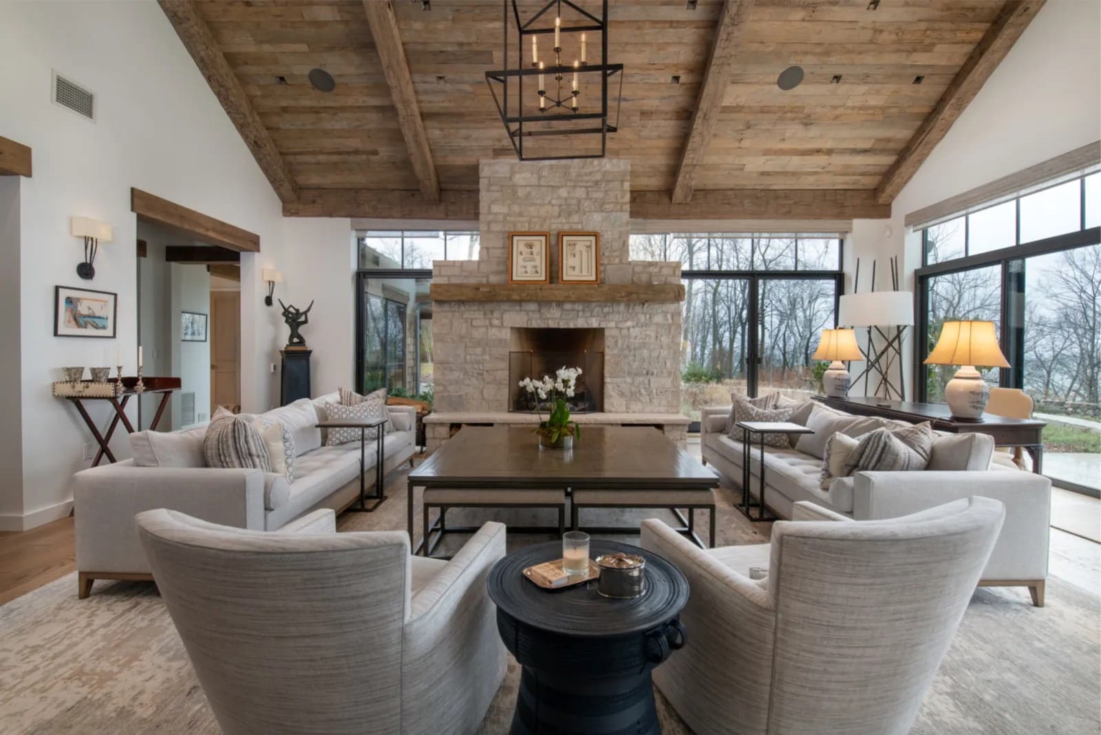 Set on the western shore of Lake Michigan, this stunning new construction residence blends contemporary design with the rich character of our reclaimed woods. The result is an expansive, comfortable home that feels both modern and warmly inviting. Large cold-rolled steel windows and doors flood the interiors with natural light, seamlessly connecting the living spaces to the surrounding landscape.
