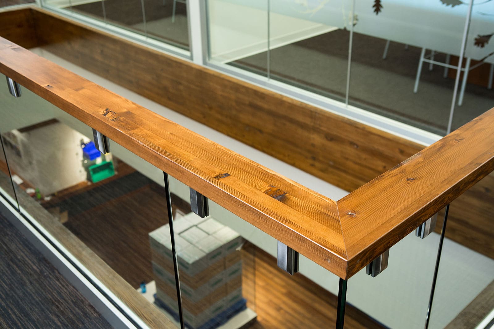 • Once large, laminated structural timbers turned decorative beams now secure the glass perimeter on the second floor, as well as structural stringers on the main stairwell near the reception area