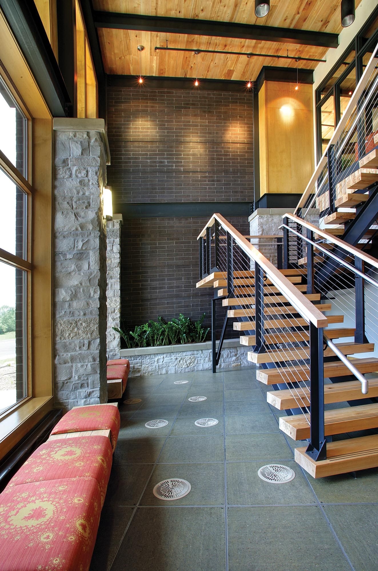 The second floor Founder’s Room features a table constructed of Douglas-fir salvaged from a Hydro-Electric Plant along the Fox River near Appleton’s College Avenue bridge. Next door, the massive Board Room table is made of salvaged Rock Elm from a barn near Wausau, Wisconsin. In the Lobby, the large upholstered benches and the stair treads are from the Thomas Edison building. The Maple stair treads are milled to 4.5” thick, making them a striking feature of the lobby.