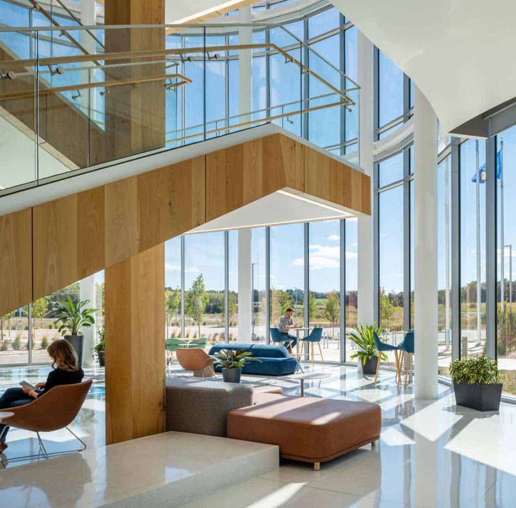 The warm reclaimed wood, with its natural character, provides a stunning contrast to the neutral office spaces and the sleek, undulating exterior.