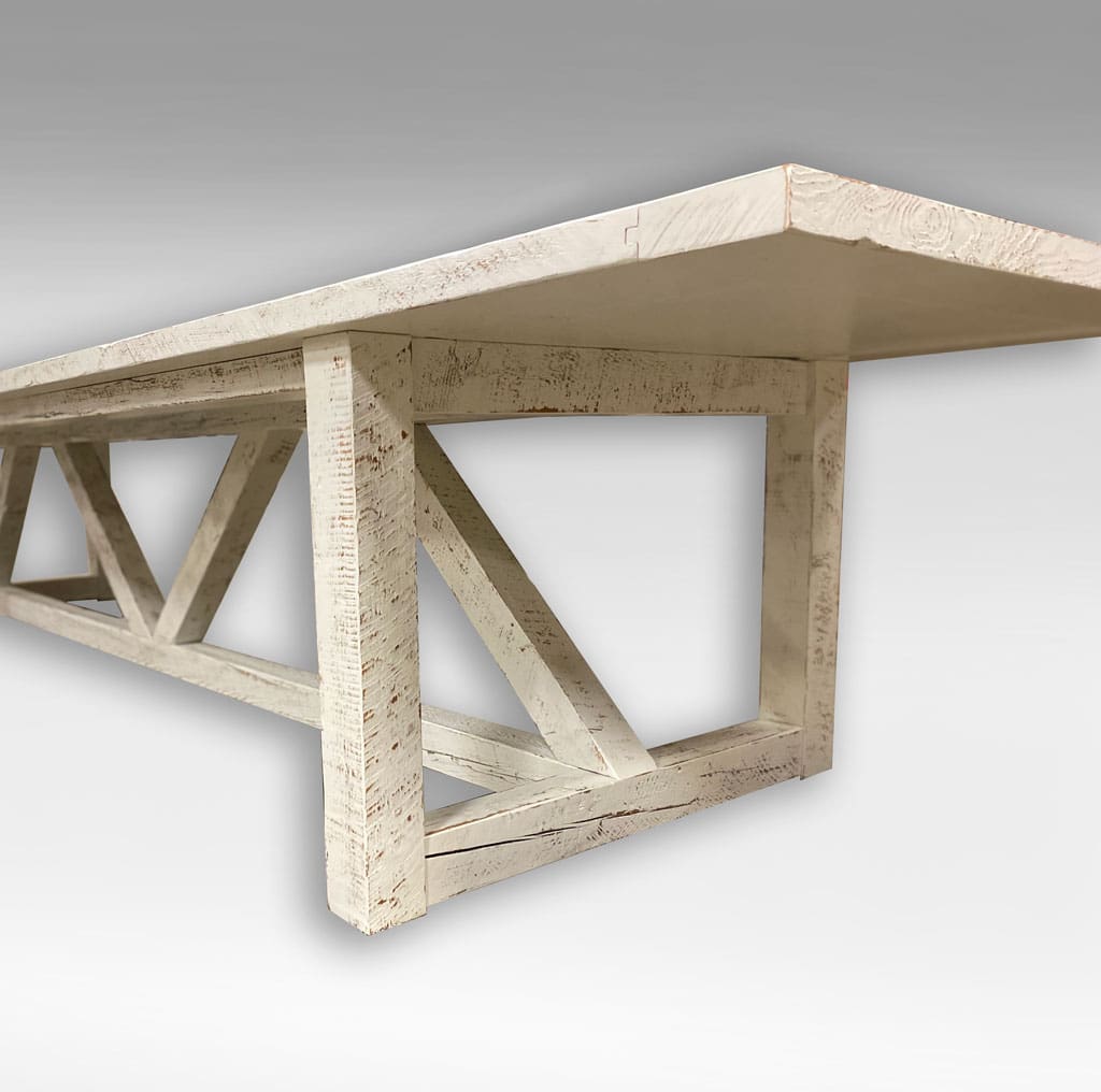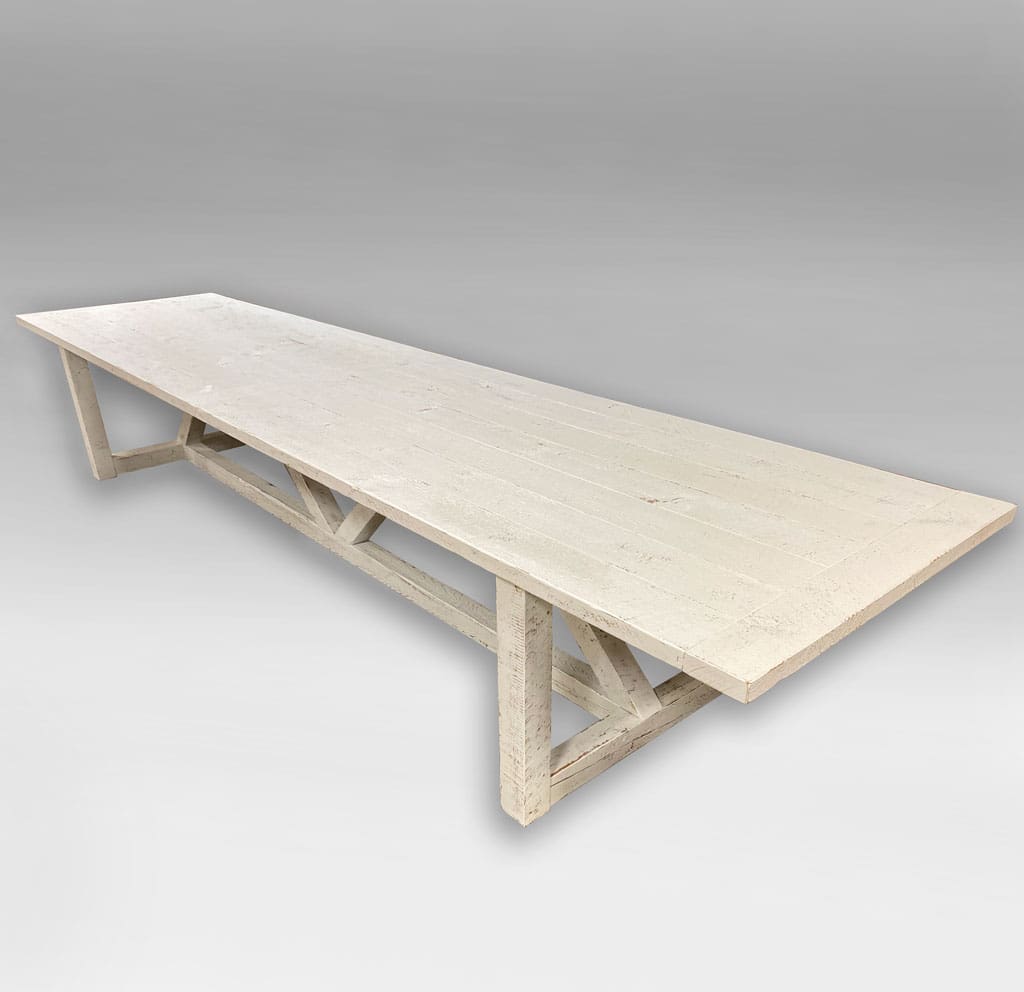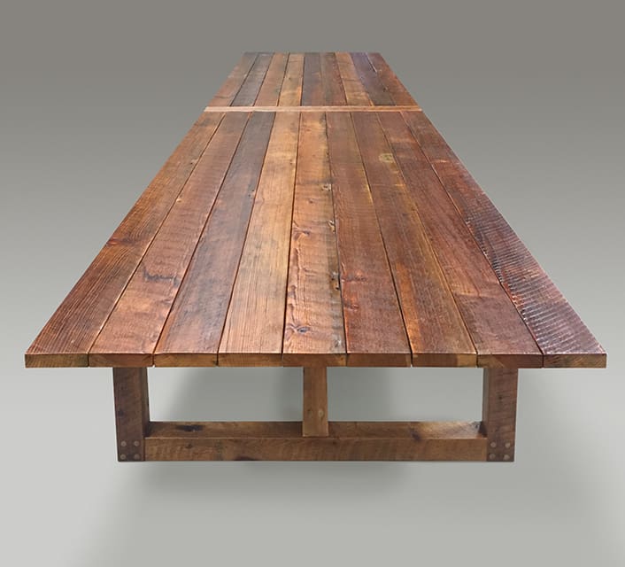 Our Lap Joint Timber conference table is shown here in reclaimed heart pine salvaged from factory floor joists. Available in white or any of our custom finishes.