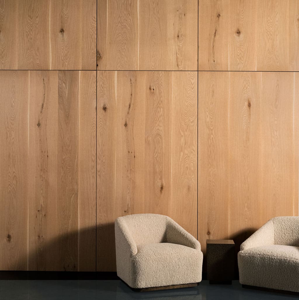 Shown here in a matte clear finish, white oak is one of our most sought-after veneer. While contemporary cutting techniques often edit out more expressive grain moments and variation, our live sawn approach is a celebration of the whole oak tree. A ribbon of sap wood here and there and inclusion of small knots keeps nature at the center of modernist wood paneling.