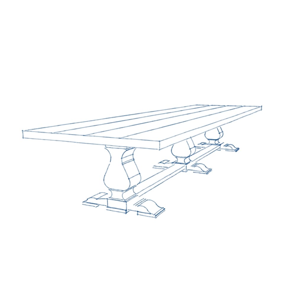 Three large-scale, handcrafted pedestal bases supported by a reclaimed pine stretcher completes our updated version of this 18th century classic.