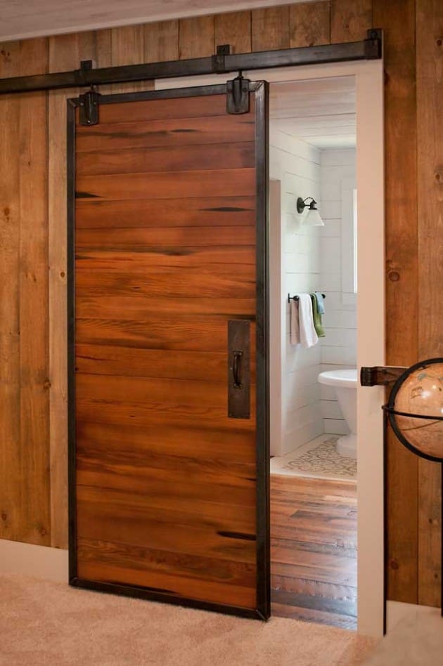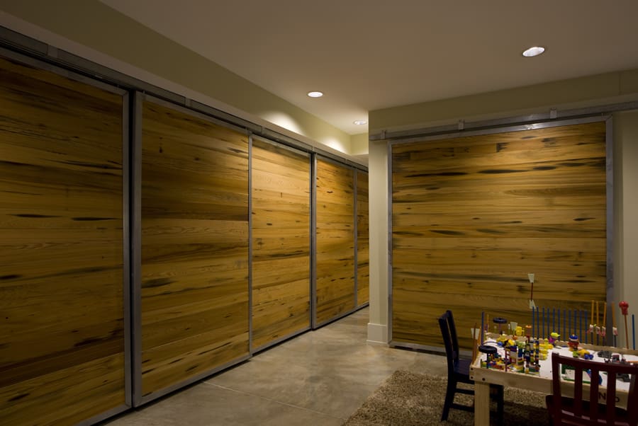 Locally made steel frames create our most industrial and modern reclaimed barn door options. Pair with streamlined or prominent hardware to customize for your space. Our track-and-roller systems allow doors to glide smoothly and effortlessly and are available in natural clear, powder coat black, and galvanized.