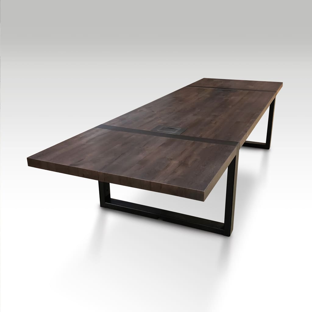 Also featured is our Distillery table top with reclaimed white oak in our popular smokehouse finish. Shown at 12′-6″ x 4′ x 30″H.