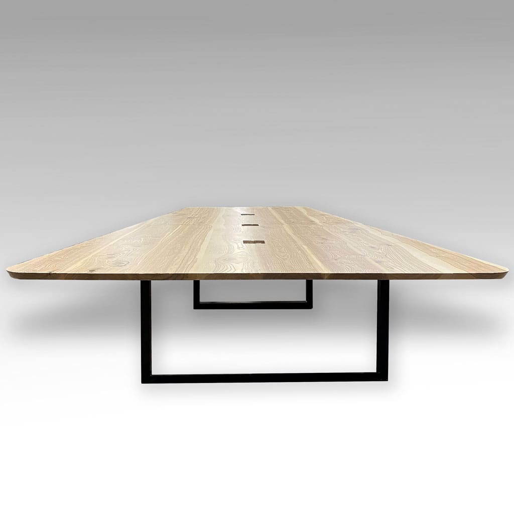 Pictured here is our trapezoid-shaped urban ash table top in matte clear. Shown at 14′ x 5′ – 8′ (tapered) x 30″H.