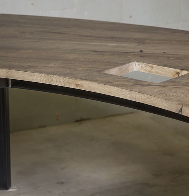 New vertical grain white oak provides one of our most durable and elegant custom curved tops for this media table.