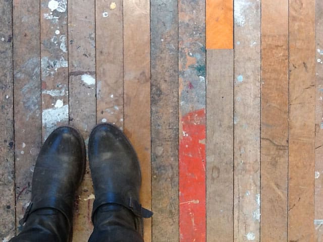 We couldn’t resist sneaking in a shot of the splattered factory maple floors in our office, too (that’s the one with the great Frye boots).